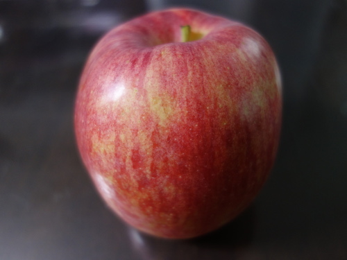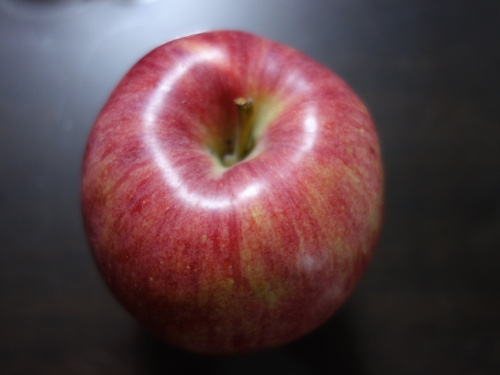 筋が入った赤いリンゴです。このリンゴに限っては縦長です。