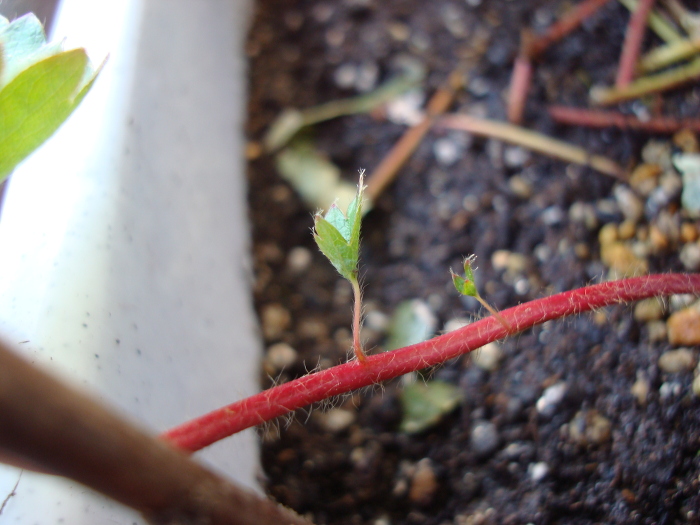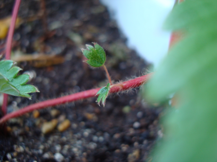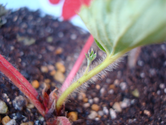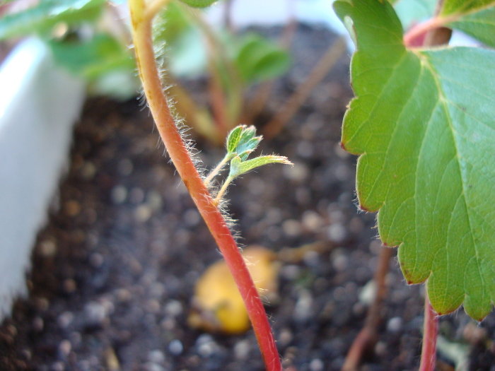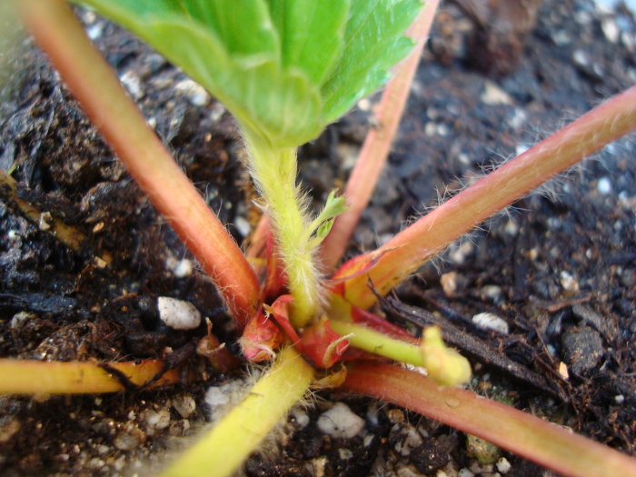別の苺の苗も見てみると、福王の苗にはクラウンのところに今から大きくなる新しい葉っぱ1枚が出ていて、その1枚の葉柄だけから小さな葉っぱが出ていました。興味深いので、しばらく観察してみます。