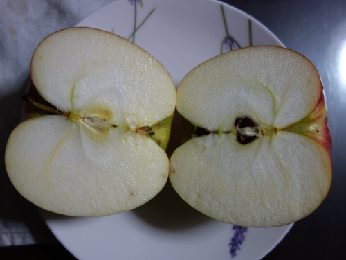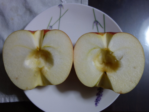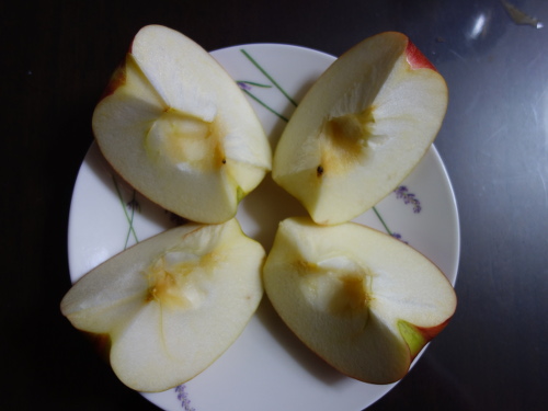 芯の部分を撮影ジョナゴールドに味と食感がよく似ていて、軟らかくておいしかったです。でも、調べてみると硬いものもあるようですので、自分が食べたものはやわらかいものでした。接頭語のサンは太陽光が当たっていることを意味しています。サン津軽は表皮にワックスが染み出ていて(塗ってないのであればですが)、サンジョナゴールドに似ています。また、食感も軟らかくて味も含めてサンジョナゴールドによく似ているというのが私の食べた感想です。両方ともゴールデンデリシャスと紅玉とかけあわせてできたものということでは共通ですので、そういう意味では似ているのも当然といえば当然ですね。