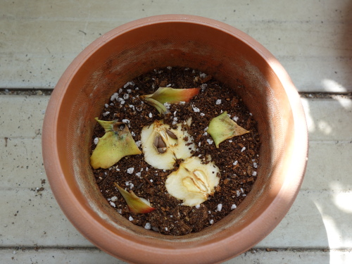 その種を鉢に入れた培養土に蒔いてみました。蒔いたというか、芯を置きました。