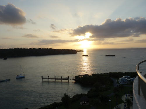 17:46撮影。ANAインターコンチネンタル万座ビーチホテルの8階客室からみた夕陽と海