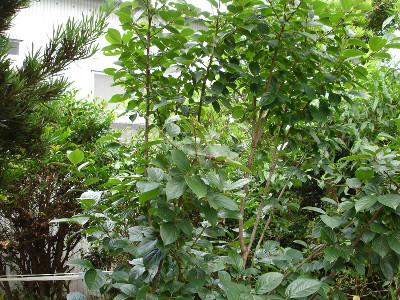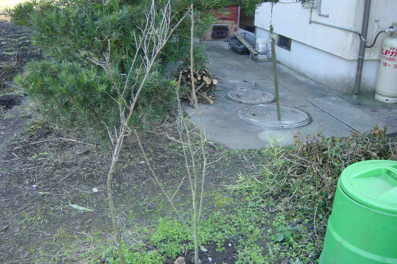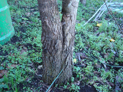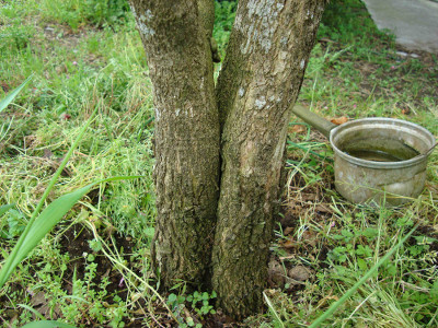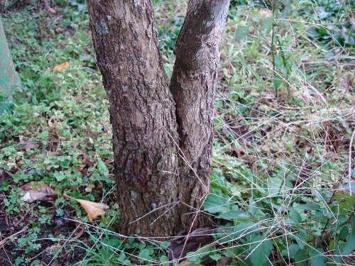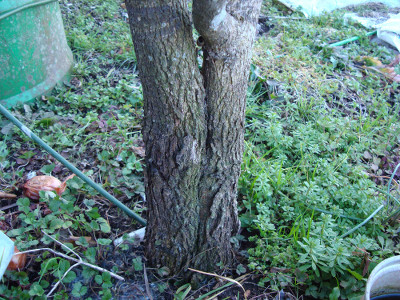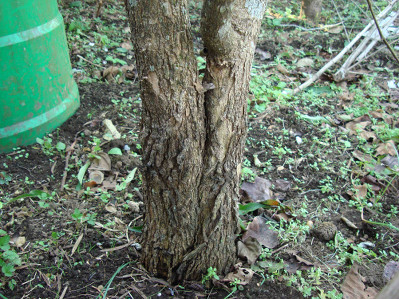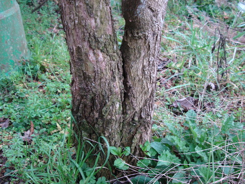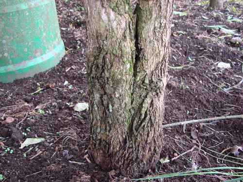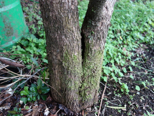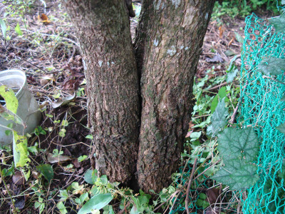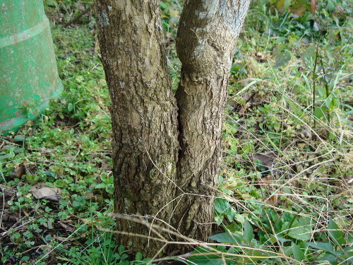 結論として、割れた幹は癒着せず、割れた幹の両側がそれぞれ独立して太くなりました。2006年7月に割れた時にはもうだめかと思いましたので、よくここまで持ち直してくれたと思います。裂けた2本がそれぞれ幹として太くなりましたので、裂けないまま生長した場合よりも結果的にトータルでは太くなったものと思われます。安定してきましたので、もう大丈夫だと思います。最初に買ってきて植えたこの太秋だけが生き残って、この木の他に後に買ってきた3本の苗木は、植えて1年ほどで全部枯れてしまいました。