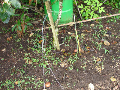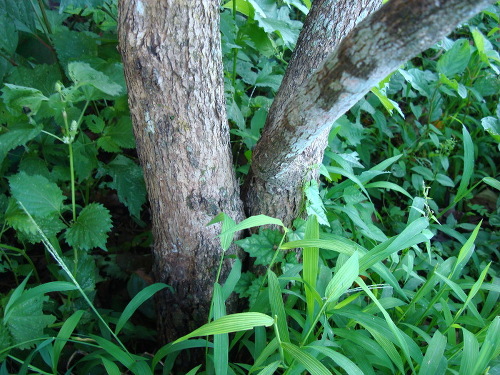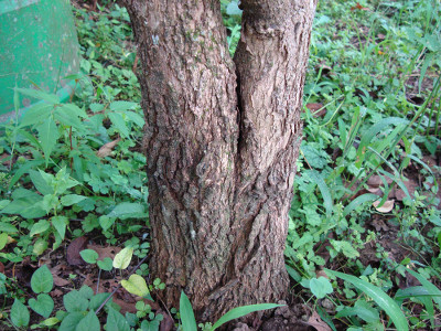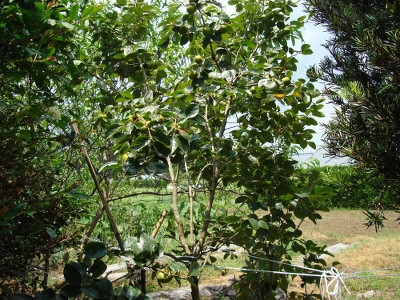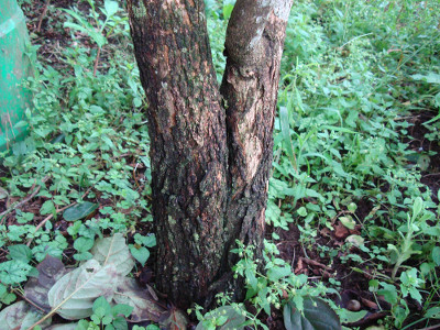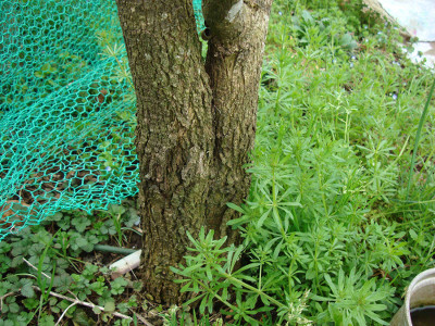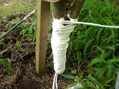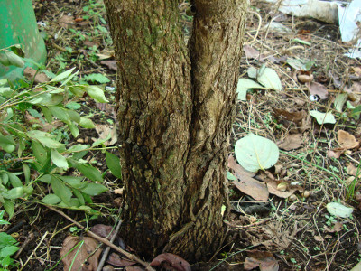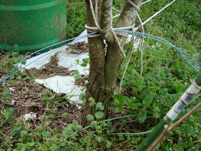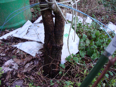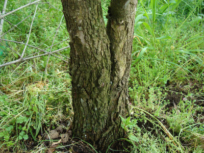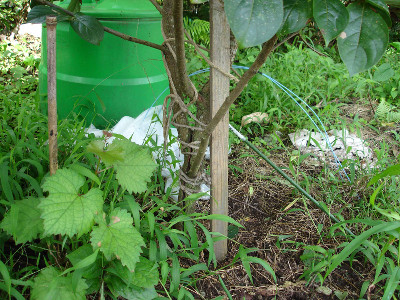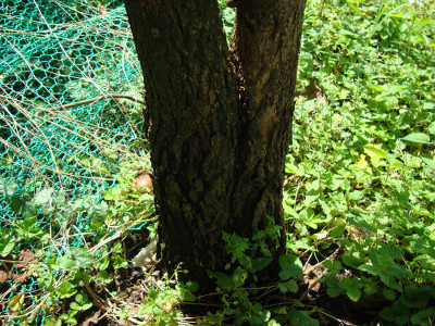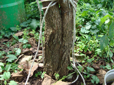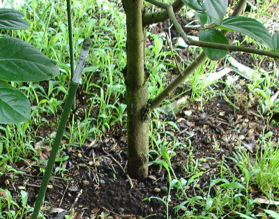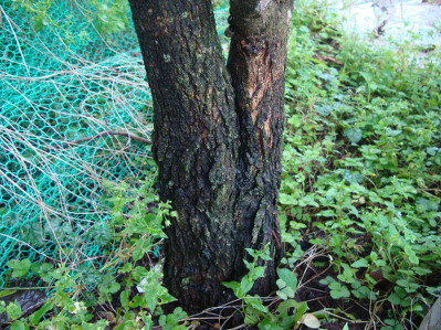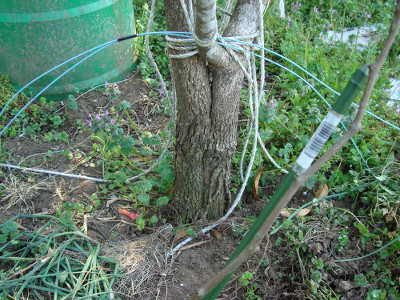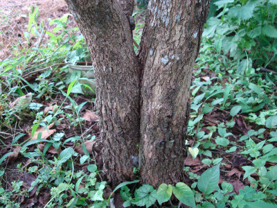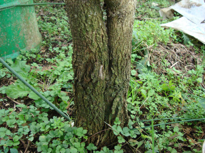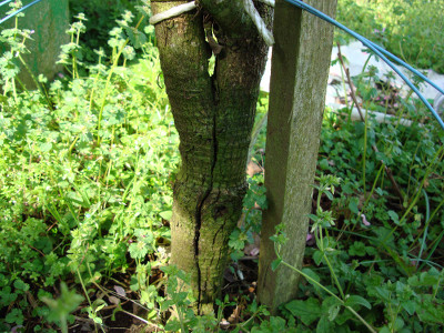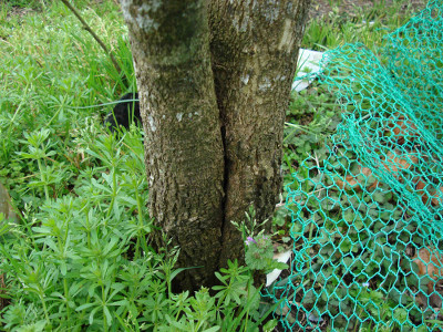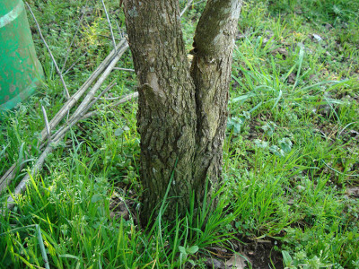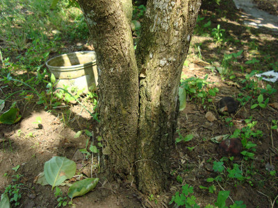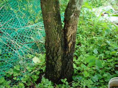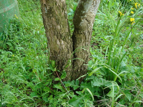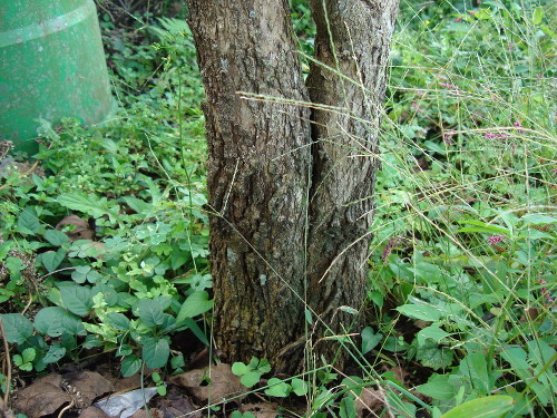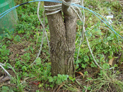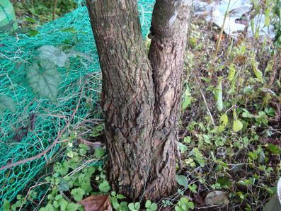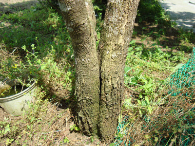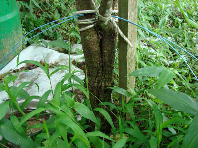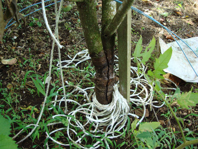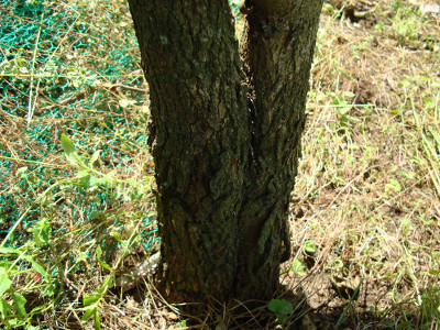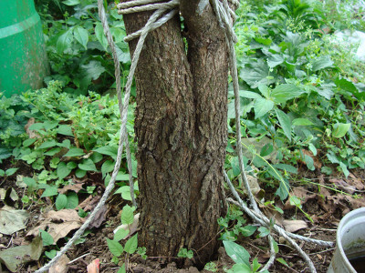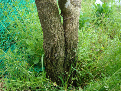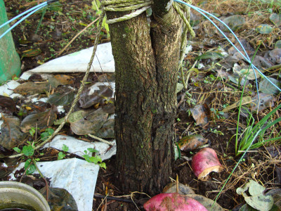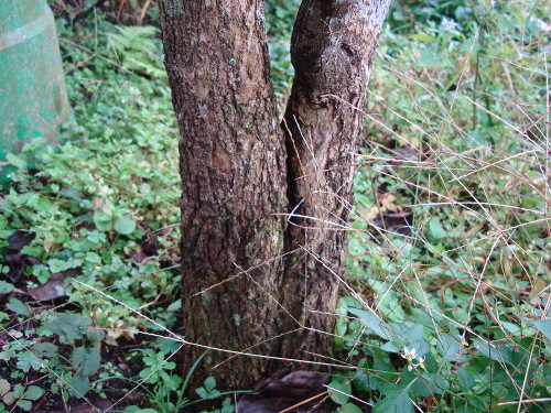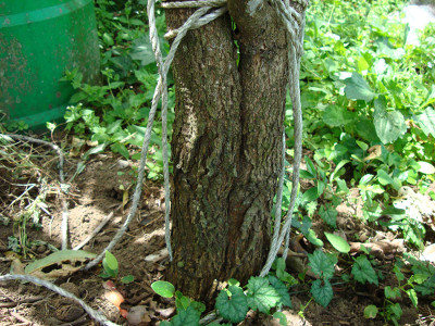 2006年7月の台風によって太秋の果樹の幹が2つに裂けてしまいましたが、その後、紐でグルグル巻きにして様子を見ました。3年後ぐらいから、何となくくっついたように見えるようになりました。実際はくっついてはいないのですが、幹が太くなって安定してきました。裂け目が癒着するわけではないことがわかります。また、2008年8月15日の写真を見るとわかるように、紐を巻くことにより幹が太くなるのが阻害されていることがわかります。よって、適当な時期に紐をとってやることも重要のようです。