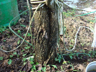台風(2006年7月)で割れた太秋の根元の修復過程