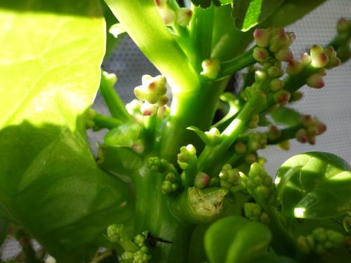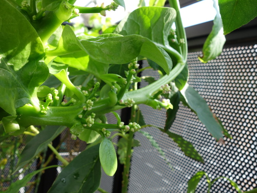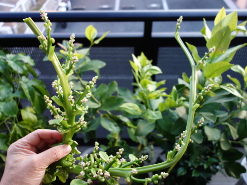 もう1本のツルムラサキとあわせた収穫。このあと2ヶ月間で2回茎を摘みました。そして、蕾ができてきました。
