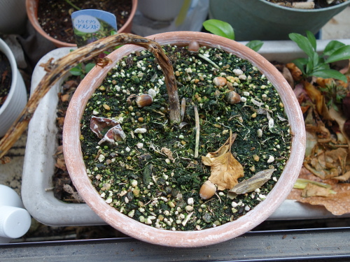 葉っぱと花を収穫して残った茎はキッチンばさみで刻んでプランターに置きました。