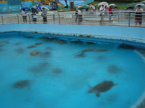 2011年10月5日、美ら海水族館は雨でした。そこで、雨宿りも兼ねて、マナティー館に行ってみました。2頭のマナティー、ユカタンとマヤがいました。水面上からと、横から(硝子越しに)観察しました。