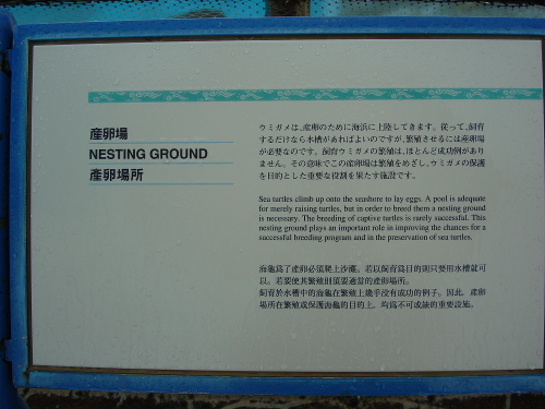 美ら海水族館のウミガメ館に行きました。ウミガメ館では、最低5種類はいるようです。アカウミガメ、アオウミガメ、タイマイ、ヒメウミガメ、オサガメなどを飼育しています。NESTING GROUNDという砂場がありましたが、飼育ウミガメの繁殖はかなり難しくて成功例がほとんどないそうです。でも、ウミガの保護の観点からは重要な取り組みであるというのは理解できました。環境の保護の啓蒙も含めて、ウミガメ館は子供を連れてくるとよいと思いました。