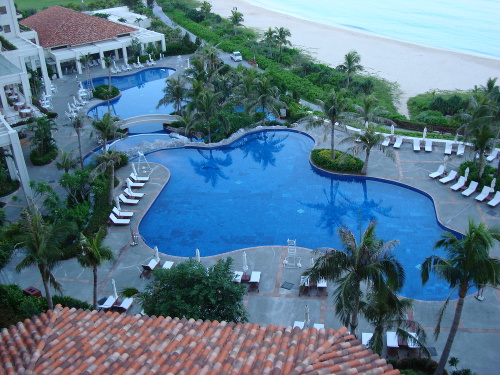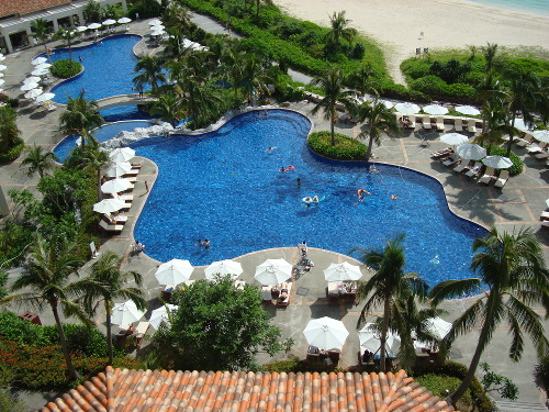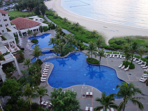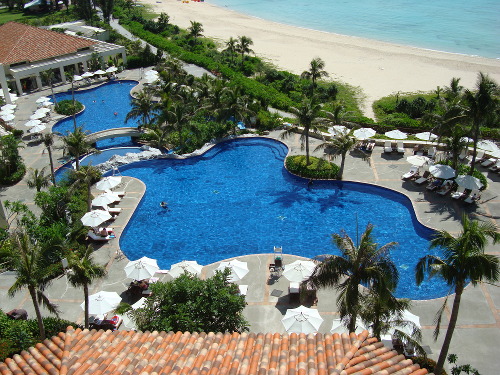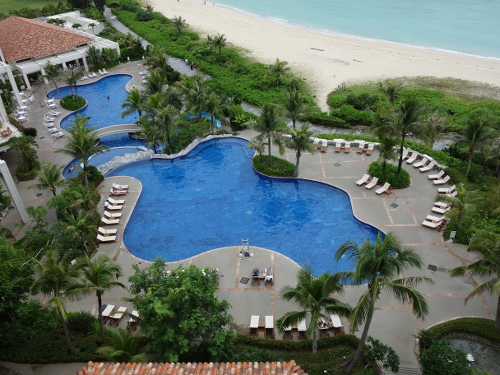 ザ・ブセナテラスのデラアックスオーシャンビューの部屋で、水平方向は同じ場所で8階, 9階, 10階の部屋から見たプールの写真を比較してみました。