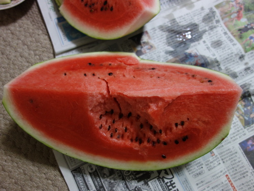 切ってみたら、よく熟れていて瑞々しい感じでした。種もたくさん入っています。4等分してもこれだけで3.5kgぐらいあることになります。