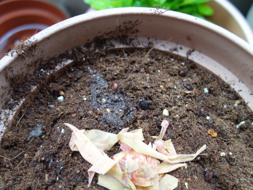 食べた後に出た種を鉢の中に入れた「花と野菜のかる〜い培養土」の上に蒔きました。中央にはたまき桃の種を植えています。