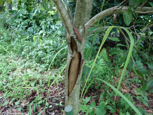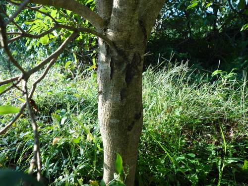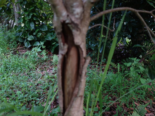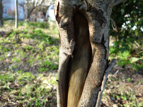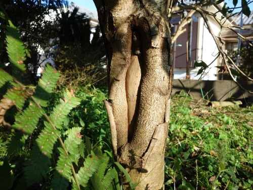 2016年3月5日現在、根元付近の幹の皮が縦に割れているのに気付きました。6月には大きく開いてきました。そして、どんどん大きく割れていきました。しかし2016年11月19日時点では、皮の部分が分厚くなってきていて、復活の兆しが見えました。2017年1月2日時点では、さらに皮が生長していました。このままみけば露出している芯の部分を覆ってくれるかもしれません。