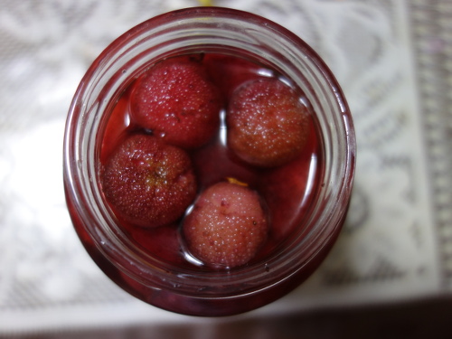 2018年6月30日現在、6月上旬に実が生っていると実家から連絡がありました。帰省できないので6月30日まで見ることはできませんでしたが、1kgぐらいあったそうです。生食で食べて、一部は焼酎に漬けてありました。けっこう粒は大きいです。市販の秀峰という品種のヤマモモの接木苗を2012年10月28日に買って来て、ベランダに置きました。2012年11月18日に実家に持って帰って地植えして、2018年6月30日現在で5年8ヶ月です。1本で生りました。幹の皮が剥げたりして木の生存自体も危ぶまれ、もう実は生らないのかと思っていたのですが、ついに生りました。来年も生ってくれることを期待します。