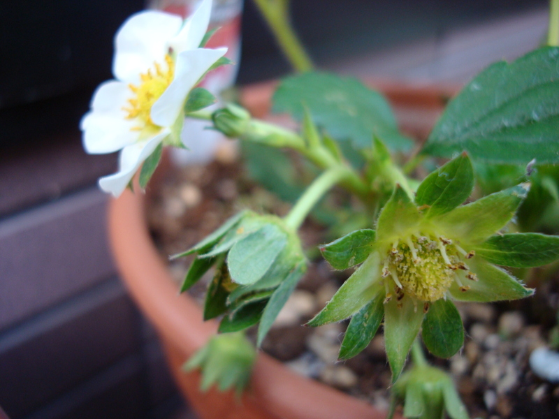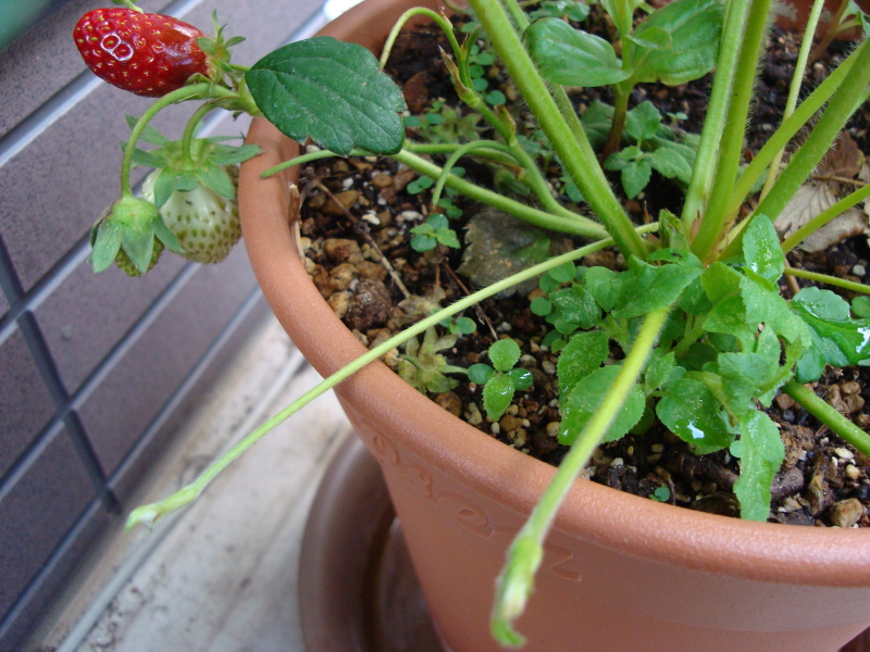 いびつな苺ですが、うっすらと赤色がついてきました。