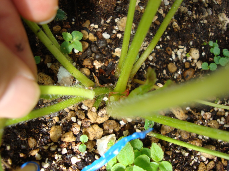 ランナーがちょうど実の下に出てきています。これが次の子株になります。2番目以降の子株が苗として使うのに適しています。ランナーが出て来るのは、親元から少し離れた所の場所に新天地を確保し、連鎖障害を避けるるためであるといわれています。毎年新しい他の草の枯れ葉、死骸も生まれるので、光合成で作られた高分子の糖であるリグニン、セルロースが材木腐朽菌により分解され、低分子の糖が出来ます。よって、枯れ葉を除去しなければ連作障害はないという理屈になります。これが自生地では連作障害がないといわれる所以です。