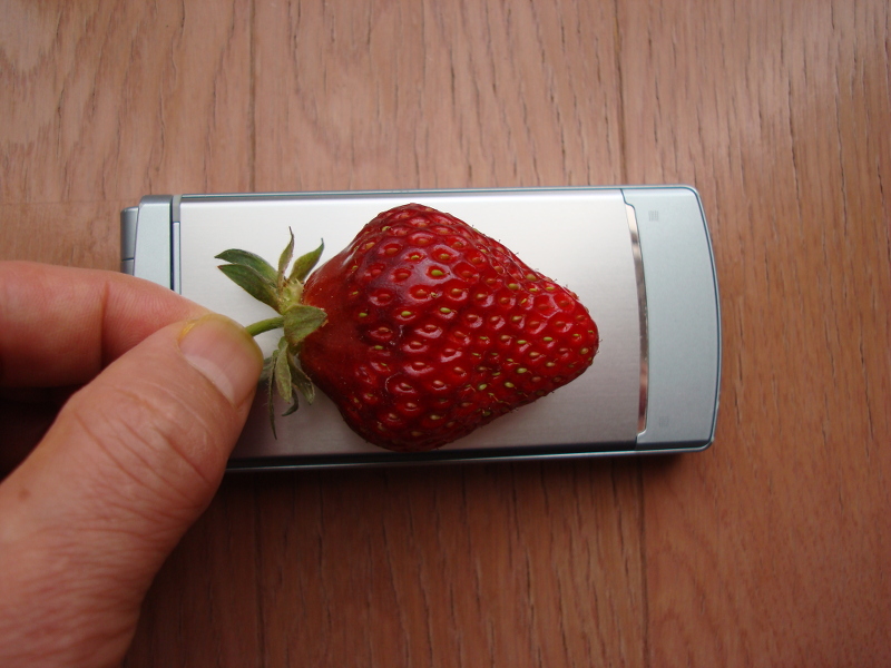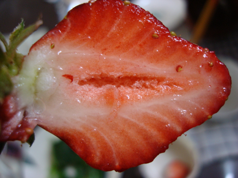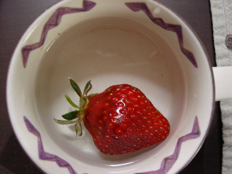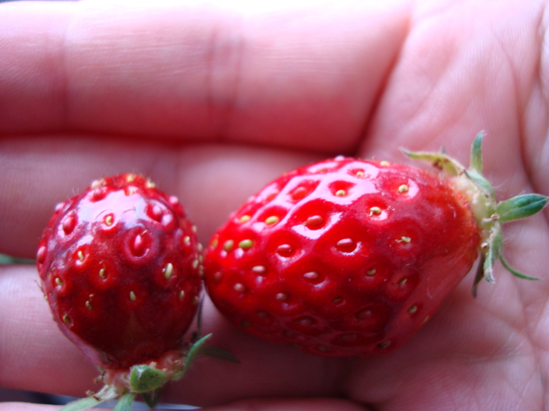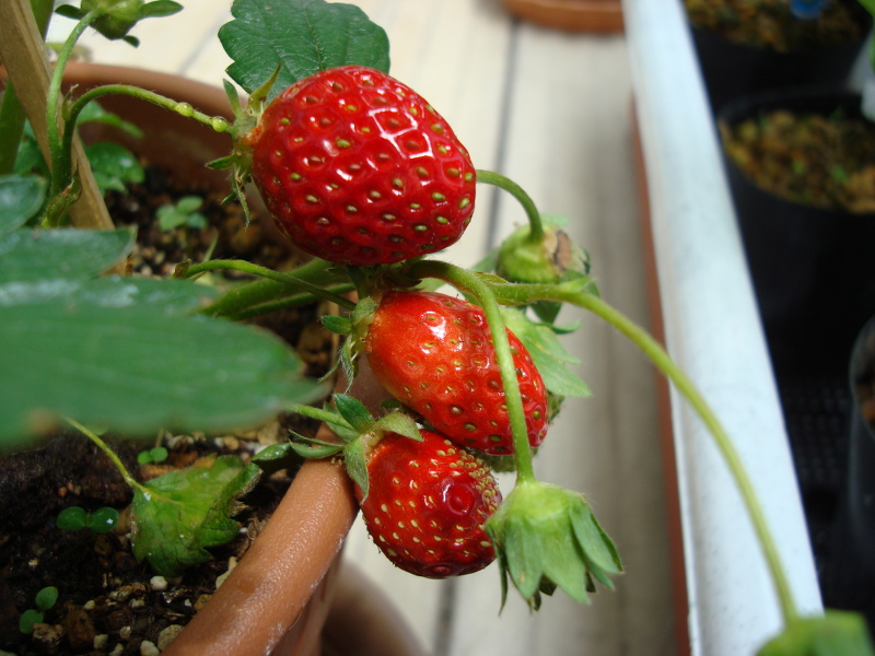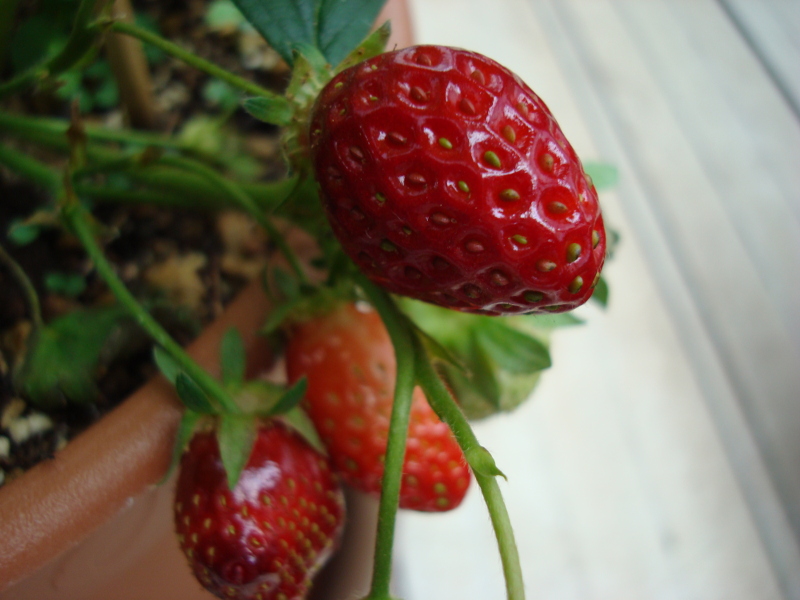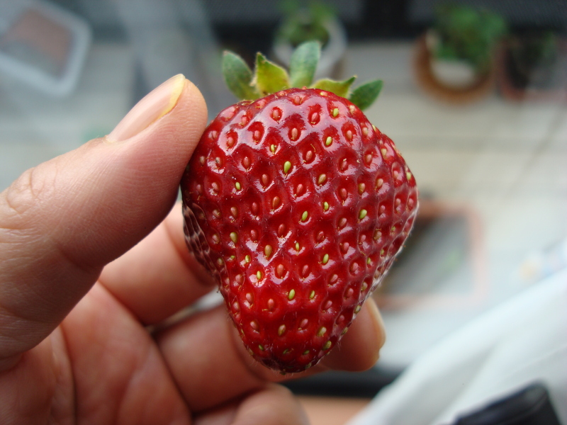 たぶん最後になるかもしれない果実が穫れました。1週間前は青かったのですが、あっという間に大きくなって熟れました。色も形も良く、味の方は、酸味があって、甘味はそこそこでした。何と言っても香りが強く、イチゴという感じでした。大きさは携帯電話の半分とまではいかなかったですが、けっこう大きくなりました。切ってみたらスイカのように中が空洞になっていました。あとは、ランナーを伸ばして苗を作ろうと思います。