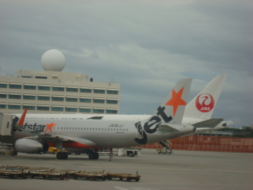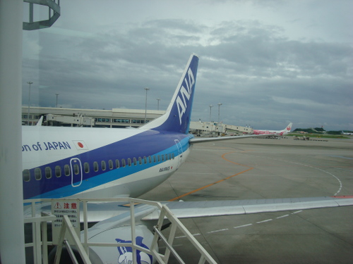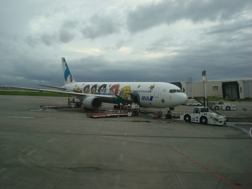 今回、沖縄では青空ではなく灰色の空でしたが、飛行機が飛んでいる時に何枚か写真を撮りました。面白い形の飛行機もありました。また、ジンベエザメの絵を描いた飛行機も那覇空港に止まっていました。2013年にはピカチュウが描いてある飛行機がありました。