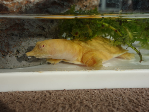 水面に顔を出して空気を吸っているアルビノシナスッポンをガラス水槽の横から撮影。