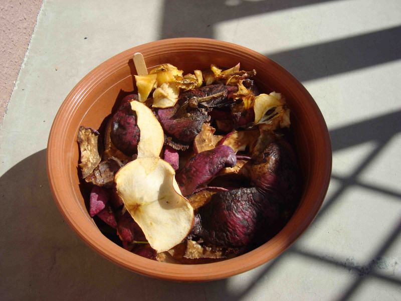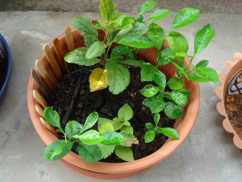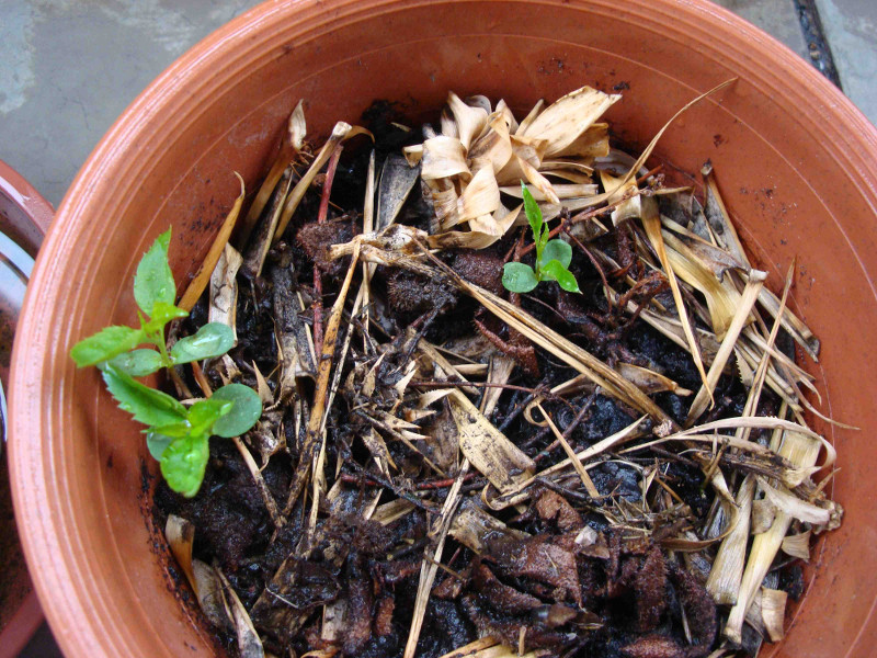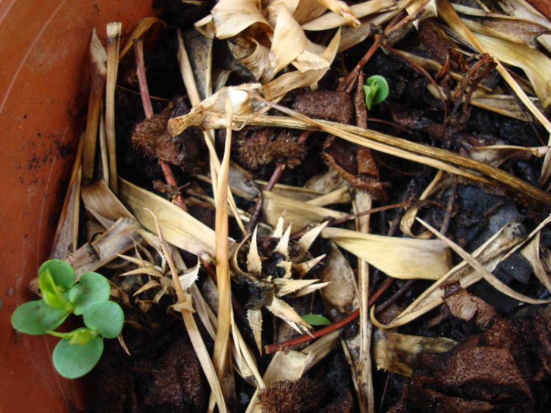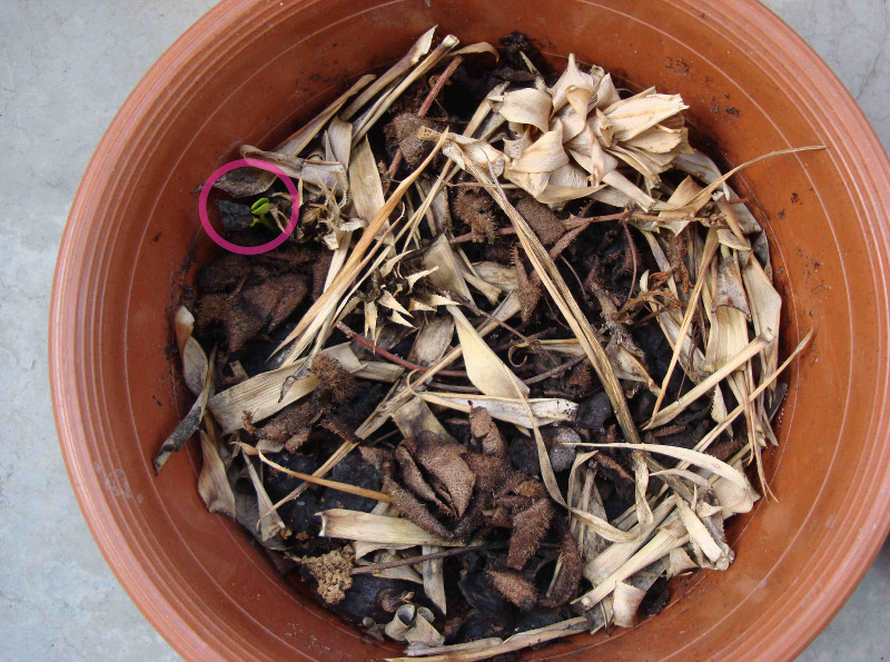 2011年10月26日(水)の時点でりんごのタネを芯ごと鉢に入れていました(右上と左上アイスクリームの棒の横)。