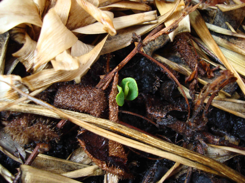 一方、りんごの木の根元にキウイの芽がたくさん出ていることに気付きました。この続きはキウイの発芽と生長のページで引き続き紹介していきます。