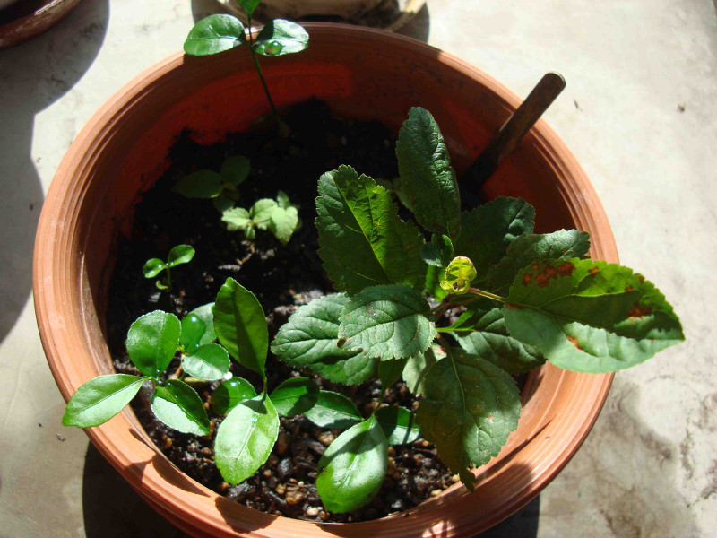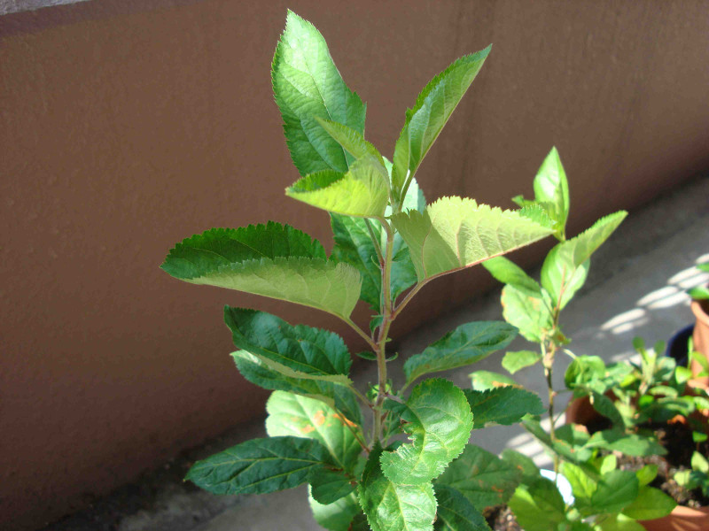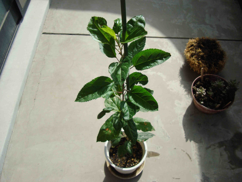 2012年4月12日、植木鉢の中で何かよくわからない種子2個から発芽していましたので、生長して何になっていくのか経過を追ってみたところ、2012年6月9日、この植物はりんご酒を漬ける時に使ったりんごの種子から発芽したものと思われます。上の写真に写っています。