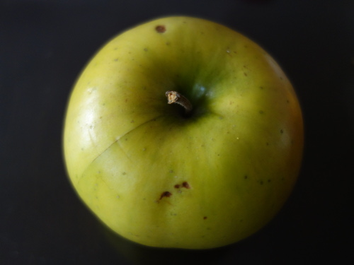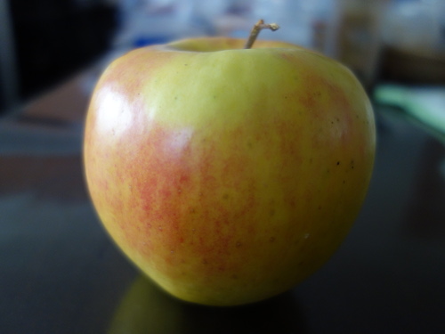 今回買ってきた2個のうちのもう1個は赤い部分は少ないです。こちらは扁平形です。こうこうりんごは扁平形が一般的のようですので、1個目より2個目の方が典型的なこうこうといえます。でも、りんごらしい形(私の持っているイメージ)は1個目です。