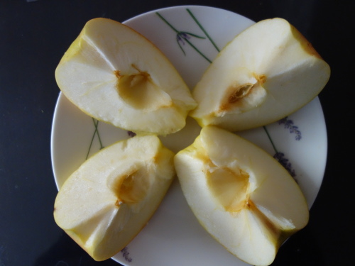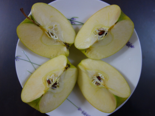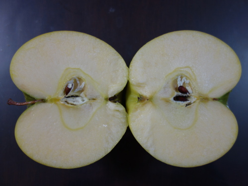 芯の部分と萼窪(がくあ)の部分と梗窪(こうあ)(果梗がついている方のくぼみ)の部分を取り除きました。食べてみたところ、前日に食べた1個目の方が軟らかくて酸味があって蜜も入っていました。