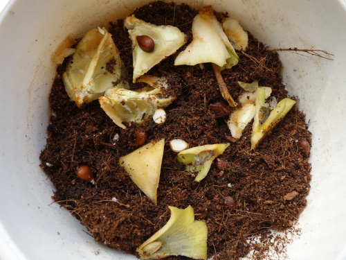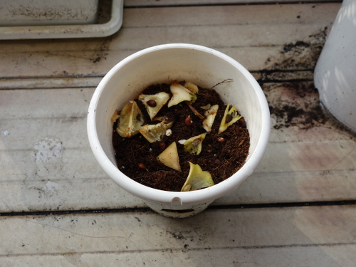 割れていない種7個と、半分に切られた種1個と、芯の部分を土の上に置きました。土は市販の「花と野菜のかる〜い培養土」を用いました。