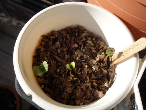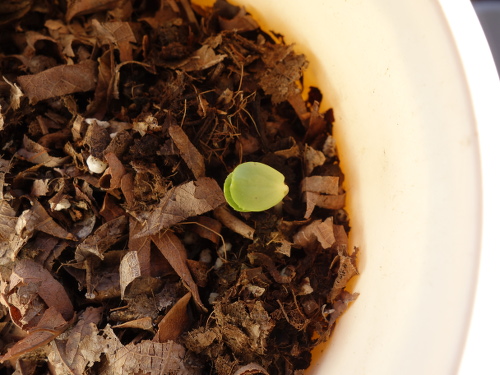 大きい方の1本の子葉。数日前には発芽していたと思われます。