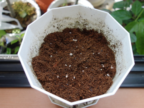 鉢に「花と野菜のかる〜い培養土」を入れました。