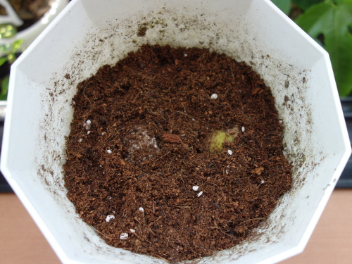 間隔をあけて2個を軽く埋めました。様子を見ながら今後土を追加します。