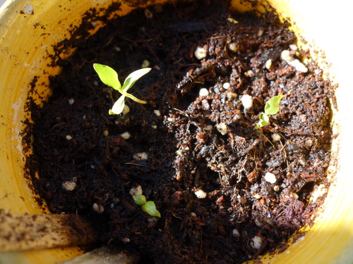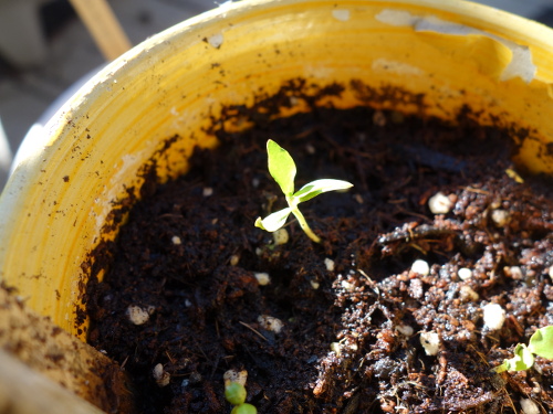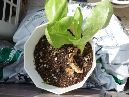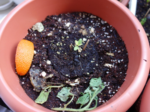 サラダ菜が大きく育った鉢に発芽した1本(左下)。 写真中央付近の小さな芽はイエローストロベリーグァバ