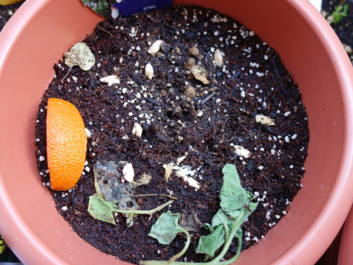 キワーノの栽培に失敗した鉢の中央にNo.1のバンシルーの実生苗を移植します。