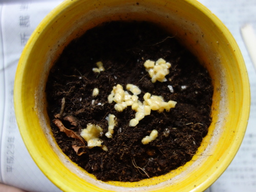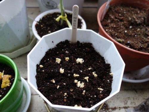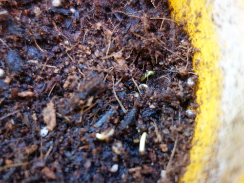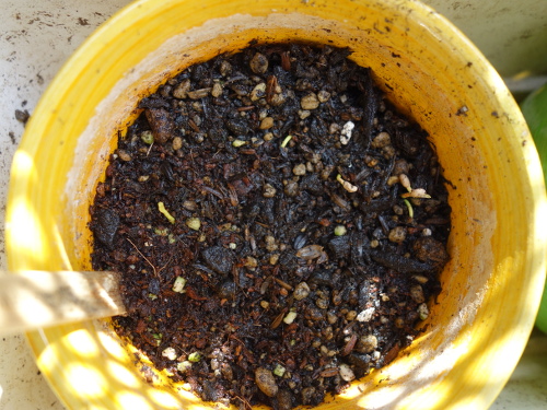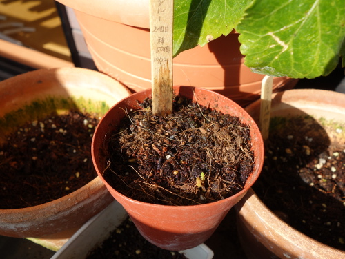3個目の鉢。この種は2個目のバンシルーからとった種です。発芽は1本確認できます。