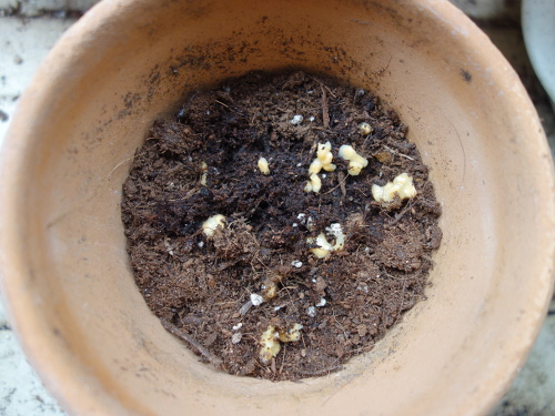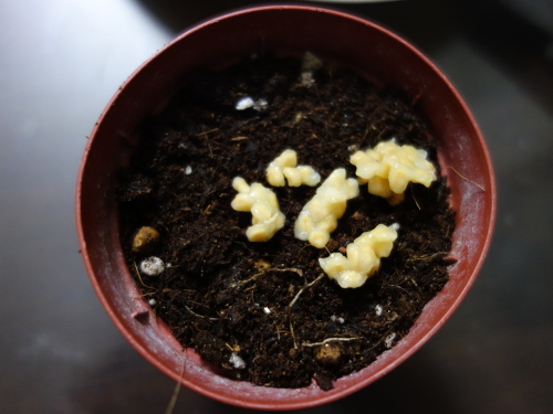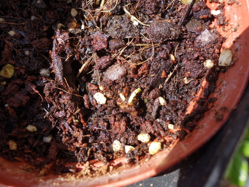 2017年11月19日現在、3個目の鉢、6個目の鉢、7個目の鉢で発芽が確認できました。いずれも種を蒔いてから1ヶ月未満です。まだ葉っぱは見えていませんが、曲がった茎が地表に現れています。現在わかっているだけでも6本ぐらいあります。2個目の鉢には1個目ののバンシルーからとった種が50個以上あるので、そのうち続々と発芽するのではないかと期待しています。実際はそんなにたくさんは必要ありません。しっかり育つのが数本で十分です。