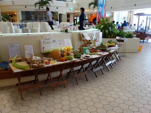 ANAインターコンチネンタル万座ビーチホテルの朝市。バンシルー(写真中央より少し右)は私が買ったのでもう写真には写っていなくて、白い敷物だけです。