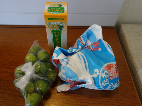 ANAインターコンチネンタル万座ビーチホテルの朝市で買ったバンシルー(右の紙袋)とシークヮーサー果実と搾り汁を客室で写しました。