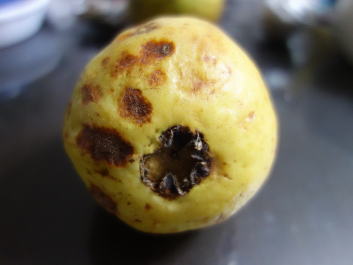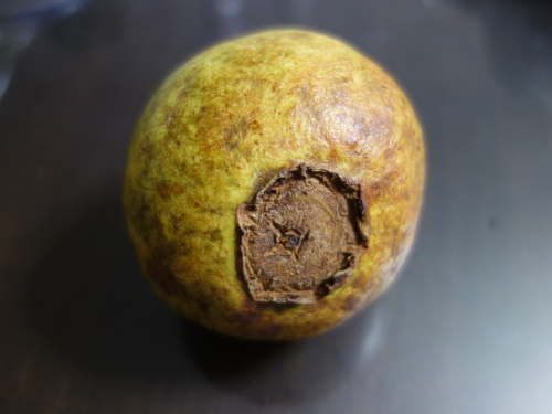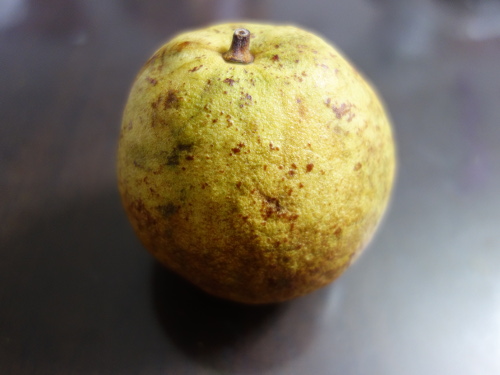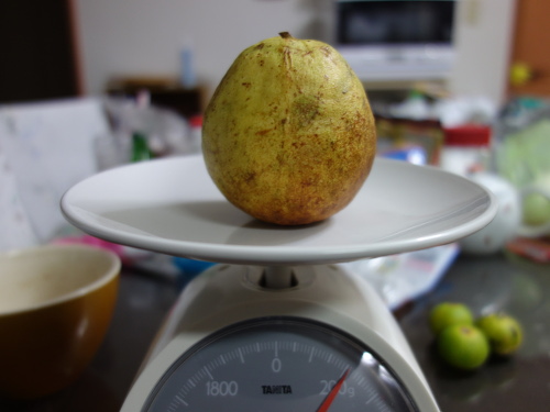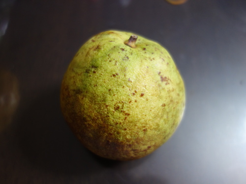 家に帰って夜に写真を撮りました。これはあまり熟していない方。洋なしのようにも見えます。