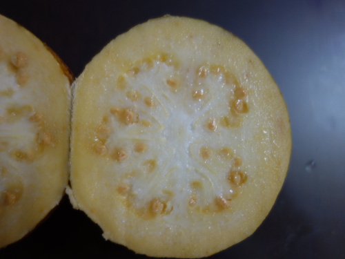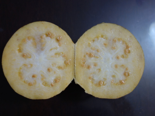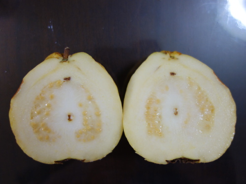このグァバはイエロ−ストロベリーグァバより大きくて、2個のうち小さい方でも1個210グラムぐらいありました(大きい方は量るのを忘れていました)。水分が蒸発する前はもう少し重かったでしょう。バンシルーを食べた感想ですが、ラ・フランスよりは軟らかいです。でも、あまり甘くありませんでした。匂いはいやなにおいではなく、甘い匂いですが、けっこう強烈でした。食感はフェイジョアに似ているかもしれません。ザラザラしているところもありました。よって、食感はラ・フランスやフェイジョアに似ていて、味はいま一つでした。イエロ−ストロベリーグァバの方が美味しいと思います。種は8個の鉢に蒔いたので、どれか1つぐらいは発芽してくれるでしょう。珍しいのでたくさん仕込みました。