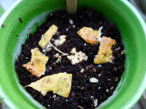 市販の培養土の上に種を蒔いて、皮も置きました。この種は2個目のバンシルーの種です。