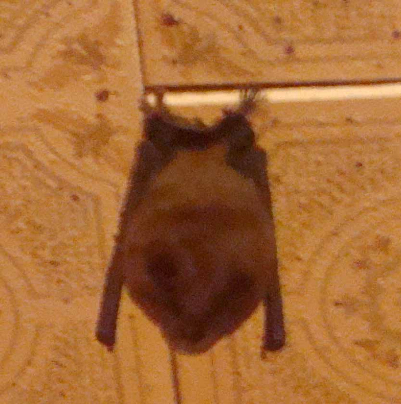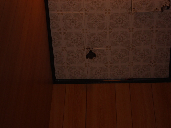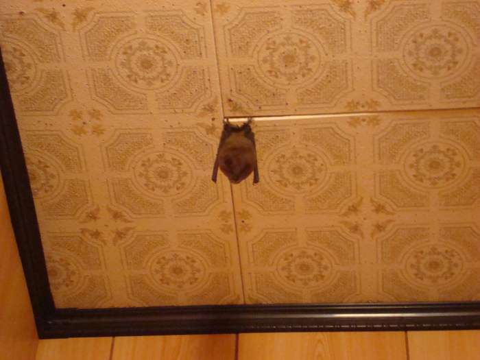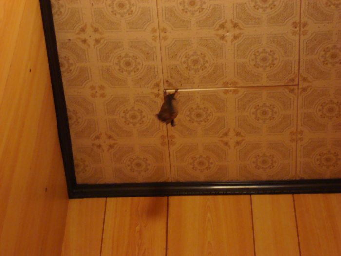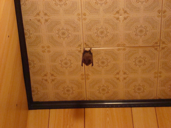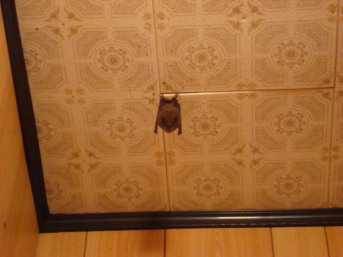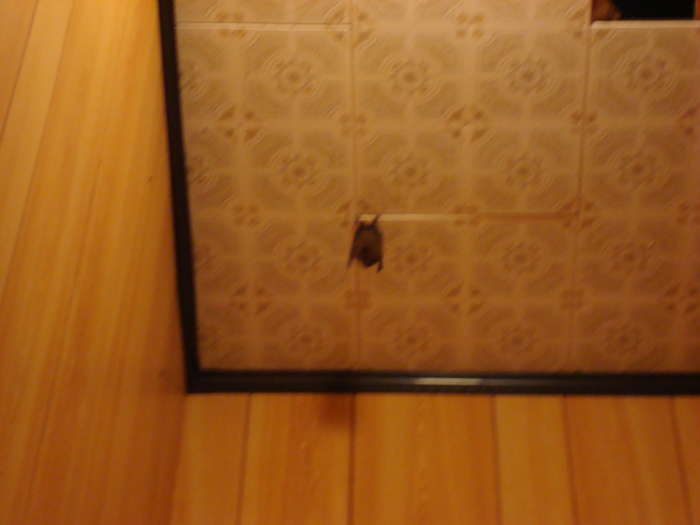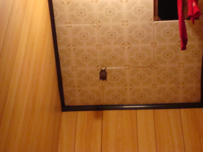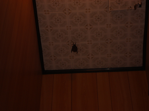 2009年あたりからでかいコウモリが2階へ上がる階段の天井にぶら下がって、下にネズミの糞のようなものを堆積させています。この当時はよく姿を見かけたのですが、それから姿を見なくなりました。でも、下の踊り場には糞がたくさん落ちています。人間が来ない時間帯には来てぶらさがっている証拠です。