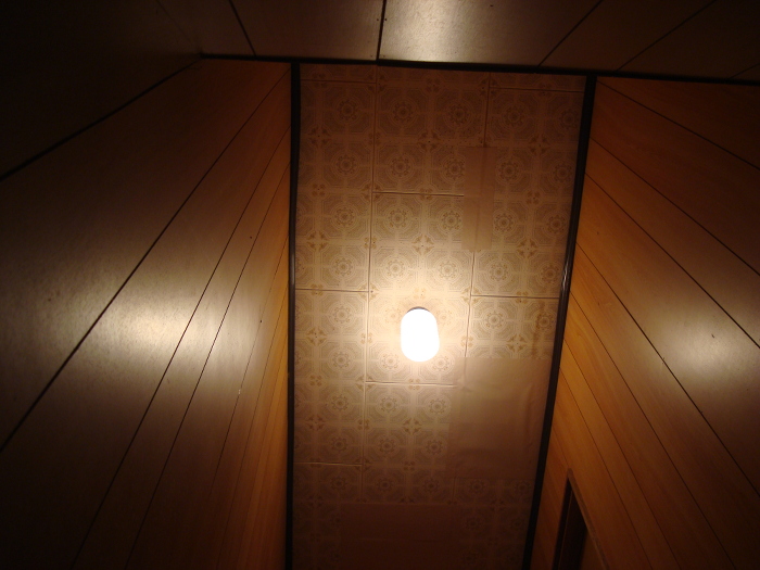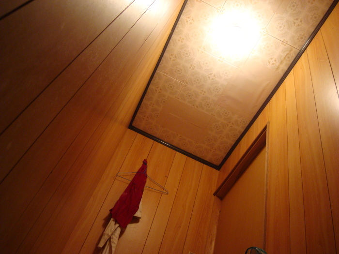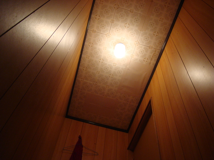 拡大写真。よく見ると重さで天井板が歪んでいます。