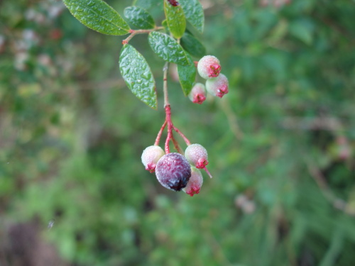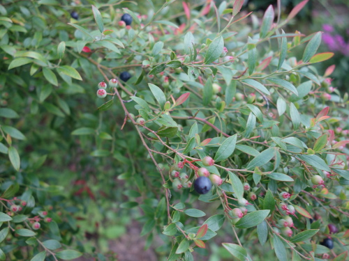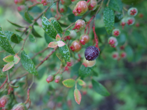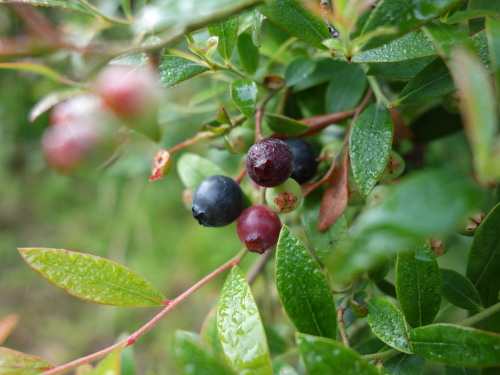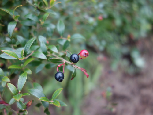 熟れている濃紺の果実は青い果実より大きいことがわかります。それでもブルーベリーよりはかなり小さいです。味はビルベリーの方が美味しいと思います。