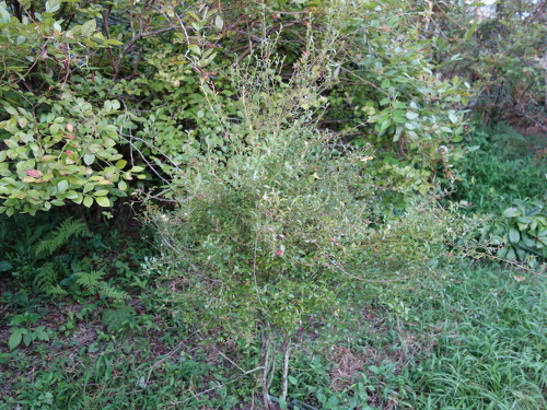 木は大きくなってはきたものの、鉢植えの場合に比べると生長速度は遅いです。一般には地植えより鉢植えの方が育たないのですが、この場合は逆です。この地植えの苗木と鉢植えの苗木は2メートルぐらいしか離れていないので、日照時間に大差ないとすれば、土との相性で差が出たといえるかもしれません。鉢植えは市販の培養土を使っています(ブルーベリー用ではなく普通の培養土です)。