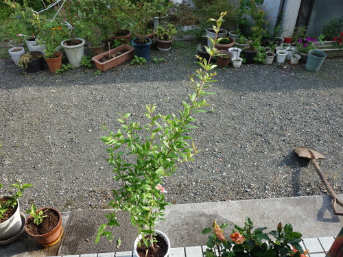2018年8月12日現在、新しい枝が数本出て来ています。ザクロは樹勢が強いので、これからどんどん大きくなるでしょう。