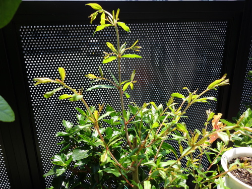 新しい枝が出て来て、メインの幹もポールの高さに届くくらい伸びました。