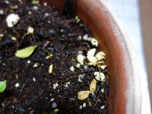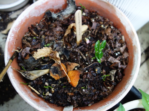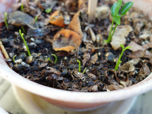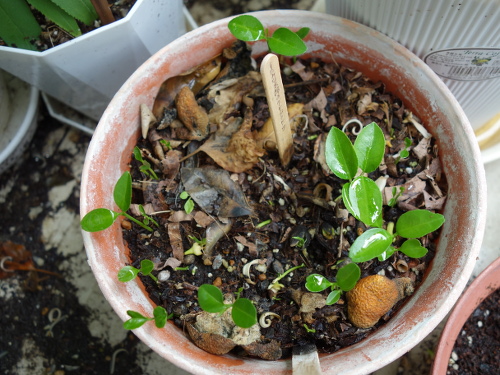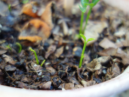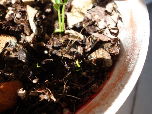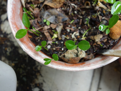 年末にもらった小みかん(紀州みかん)を正月に飾っていて、そのあと食べました。種がたくさん入っていたので鉢に蒔いていたら4月になって続々と発芽してきました。