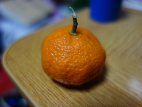 枝ごと吊るしていた小みかん。果柄の部分が折れていて落ちそうです。食べてみることにしました。(2018年1月22日)