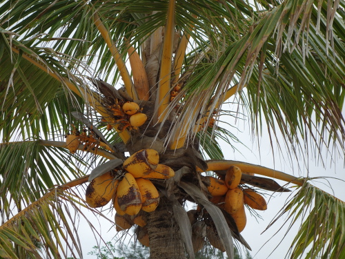 黄色いココヤシの実(ココナッツ)が生っています。