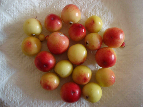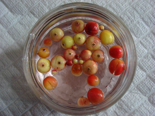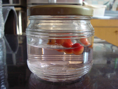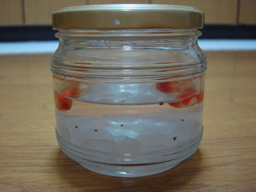 買ってきたクランベリーの苗木に実っていた果実がいくつか落ちていましたので、氷砂糖とホワイトリカーを入れて漬けました。軽くて水に浮きます。包丁で切り目を入れて合計6個漬けました。これからどんどん熟れてくるので順次漬けて行きます。ちなみに生食してみましたが、酸味があります。正直言ってあまり美味しくはありません。そういうこともあり、クランベリー酒に期待してしまいます。